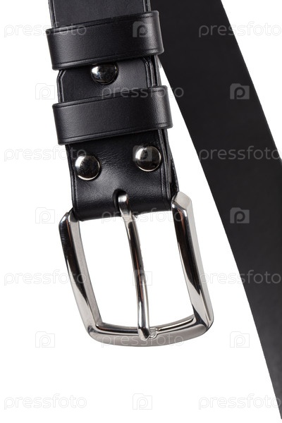 Часть кожаного ремня с металлической застежкой вблизи изолирована на белом фоне