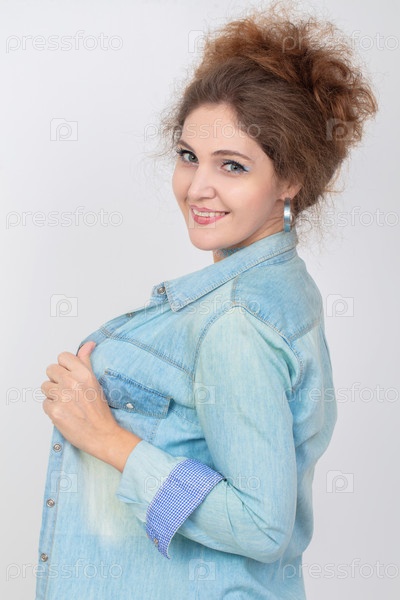 Портрет красивой молодой женщины в джинсовой рубашке, дрожащей на ней и улыбающейся