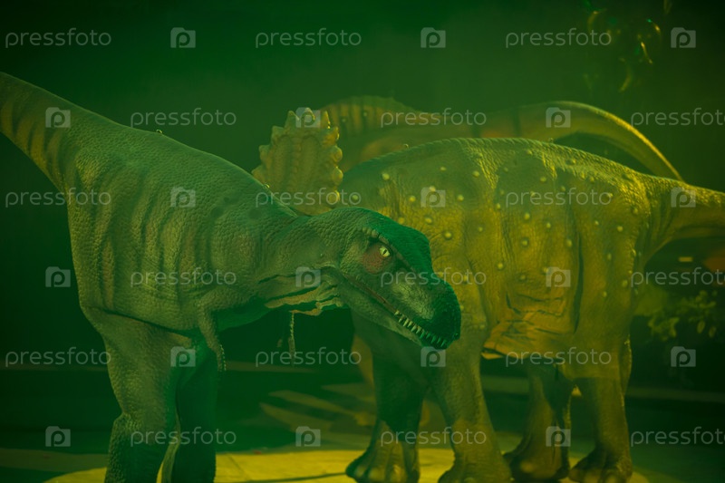 Зеленый доисторический манекен динозавра в мистическом свете