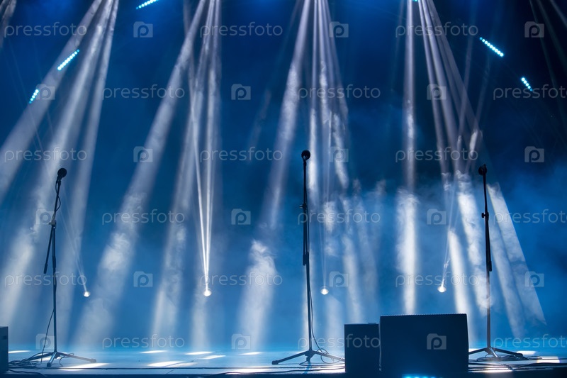 Размытые лучи света от светофоров сцены на синем фоне с микрофонами.Начало концерта или шоу