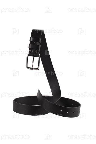 Черный кожаный пояс с металлическим застежкой красиво изоляции и изгибается на белом фоне