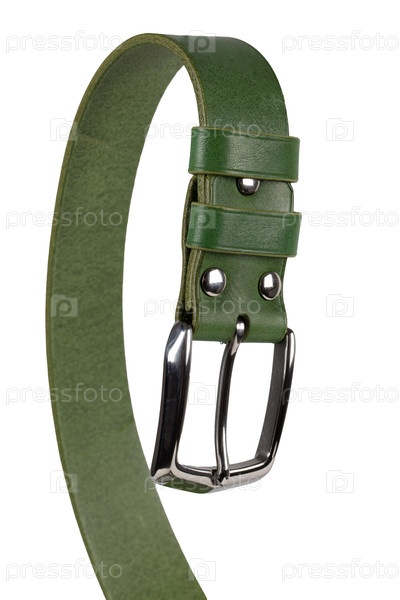 Зеленый кожаный пояс с металлическим плановым застежкой на белом фоне