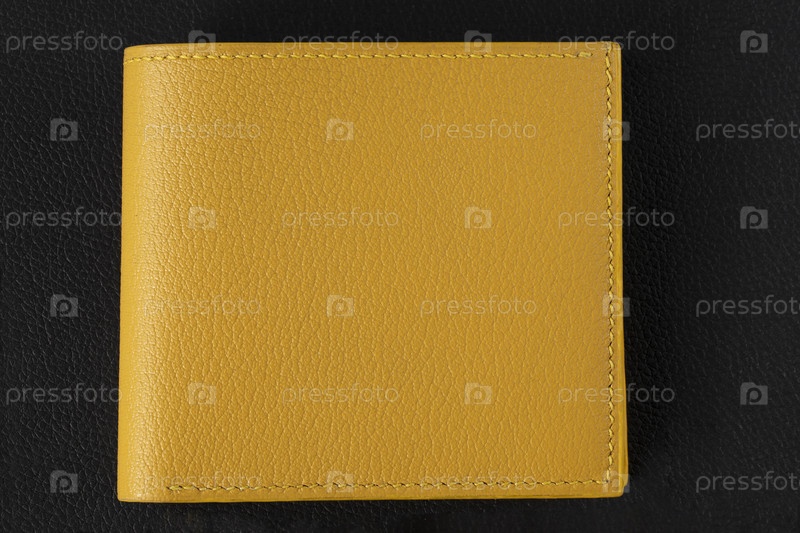 Желтый кожаный кошелек владельца визитной карточки на черном фоне