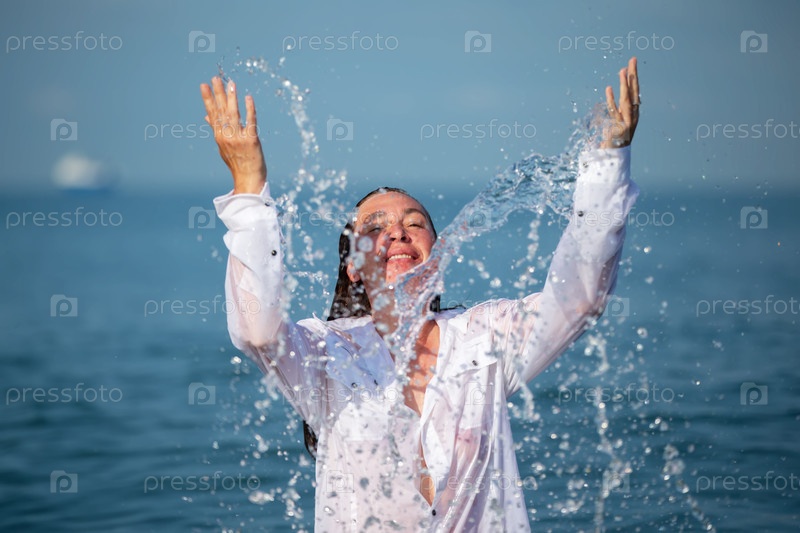 Женщина средних лет наслаждается отдыхом и брызгами морской воды