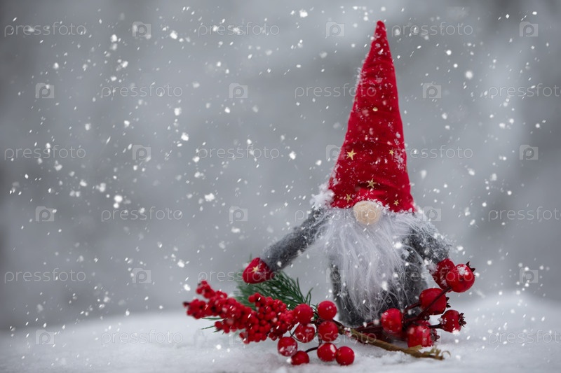 Рождественский гном с праздничными украшениями на фоне покрытых снегом еловых ветвей