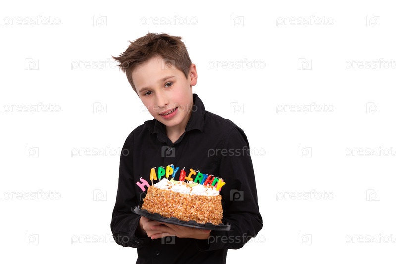 Подросток держит торт на белом фоне