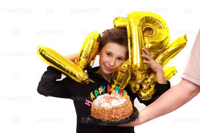 Мальчик-подросток держит золотые шарики и подает торт.Дети празднуют свой день рождения на белом фоне