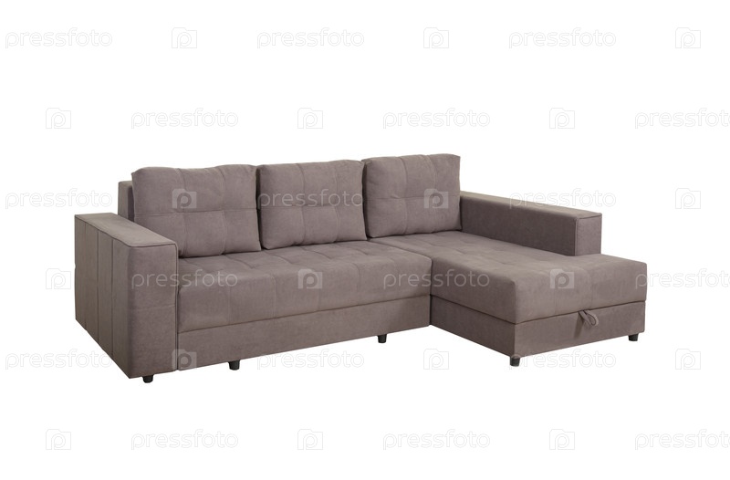 Серый угловой диван с подушками из волоконной ткани изолирован на белом фоне