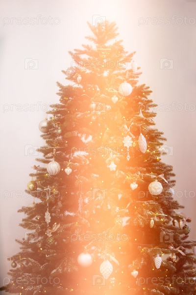 Размытая рождественская елка в бежевом оттенке с желтым оптическим лучом