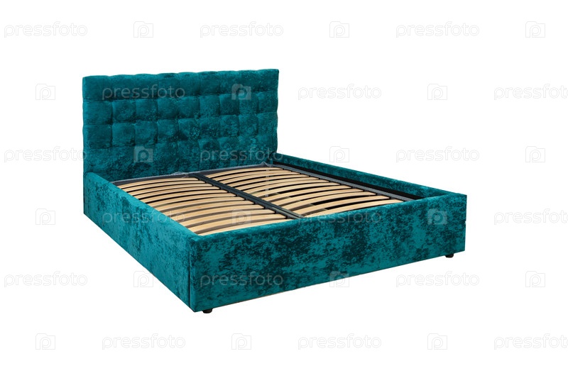 Зеленая двуспальная кровать с деревянной основой без матраса
