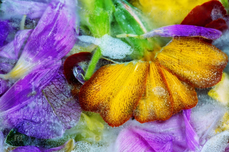 Многоцветные лепестки цветов, покрытые льдом