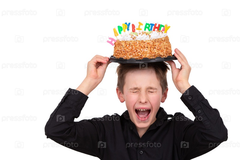 Подросток держит на голове торт и кричит, что не хочет расти.Дети празднуют свой день рождения на белом фоне