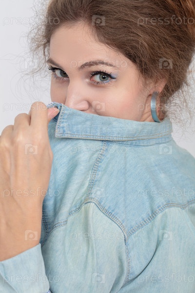 Портрет молодой девушки, закрывающей лицо рубашкой из джинсов