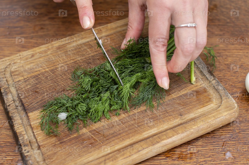 Руками нарежьте укроп на режущей доске.Сделайте овощный салат