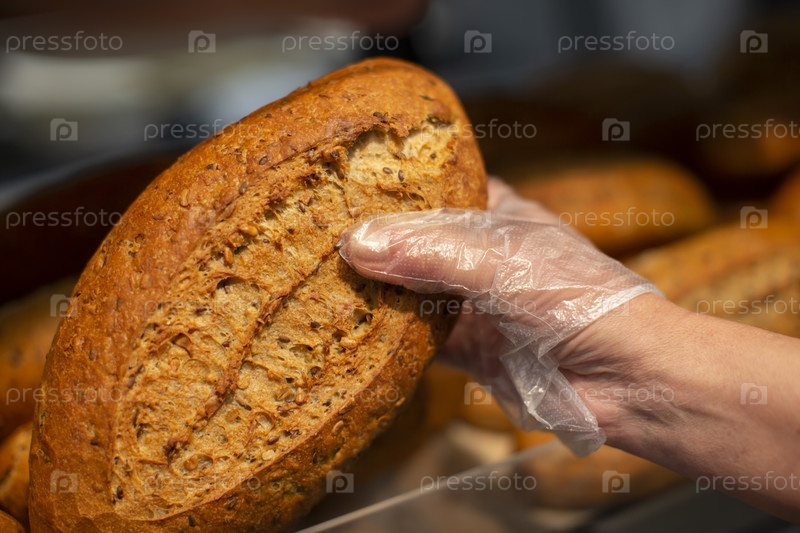 Руки, держащие ломтик черного хлеба среди размытого прилавка магазина