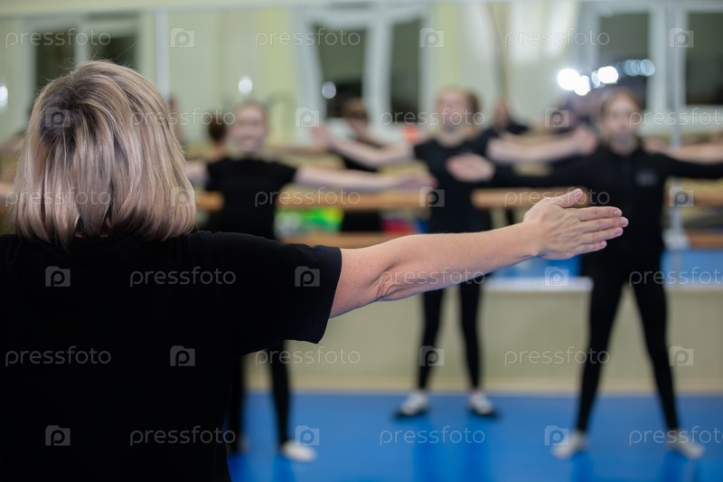 Тренер хореографа сидит спиной к камере и работает со студентами в хореографической школе