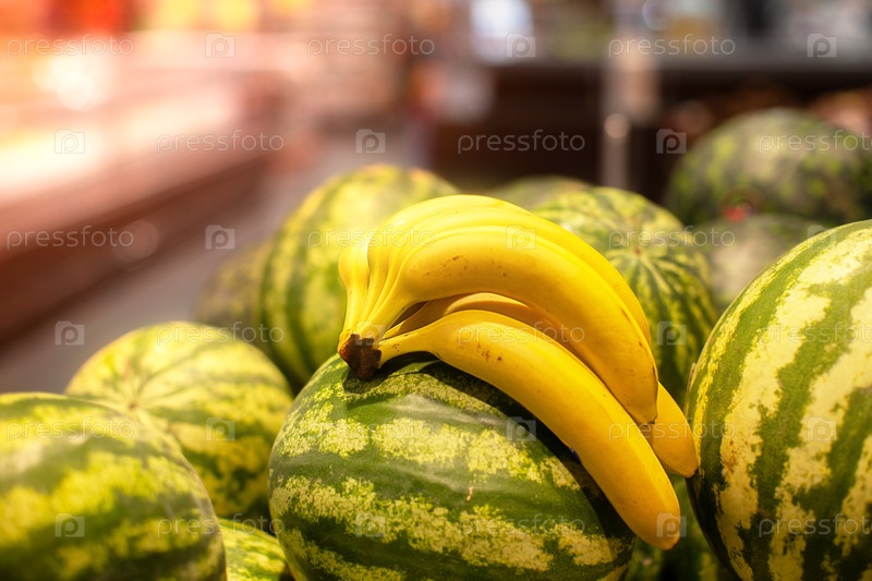 В продаже есть ветвь спелых бананов и кусок арбузов