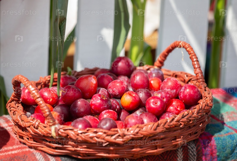 Зрелые сливы в плетеновой корзине на ярмарке
