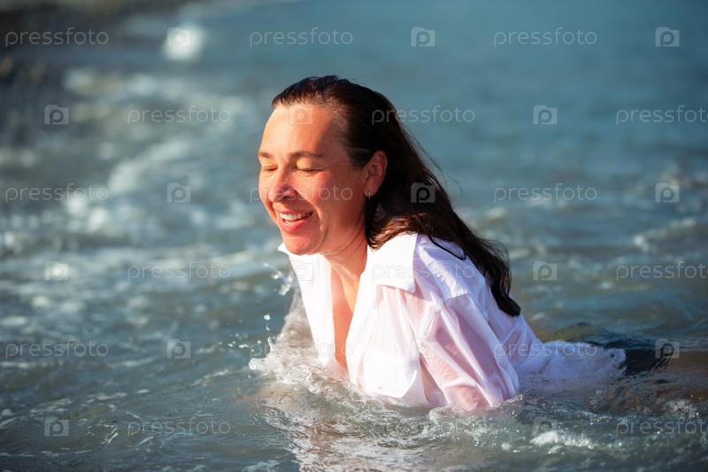 Красивая женщина средних лет в мокрой белой рубашке в морской воде