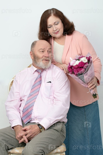 Студийный портрет пожилой пары с букетом цветов на сером фоне