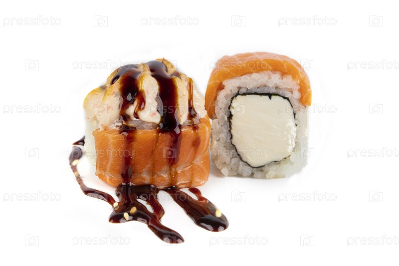Суши-ролл на белом фоне с сыром из Филадельфии и лососем, посыпанным соевым соусом