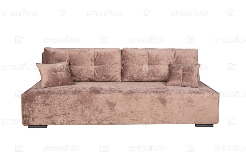 Бежевый диван с подушками из бархатной ткани изолирован на белом фоне