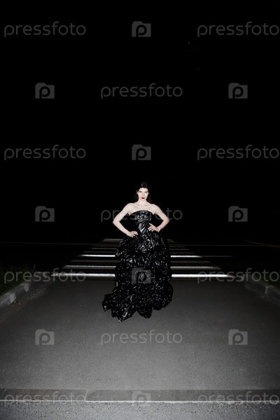 Высокая мода из мусора: платье, сделанное из мусорных мешков на ночной улице