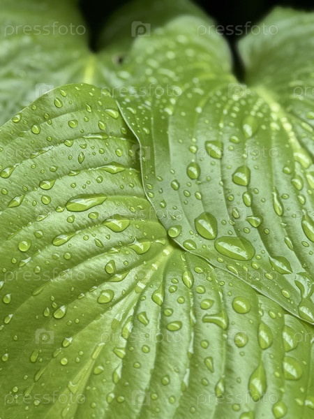 Капли дождя на листьях хозяина в летний день