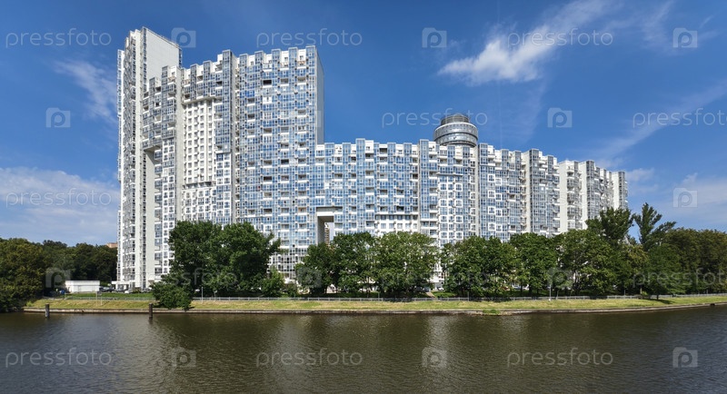 Химки, многоэтажное жилое здание, расположенное рядом с водохранилищем в окружении деревьев