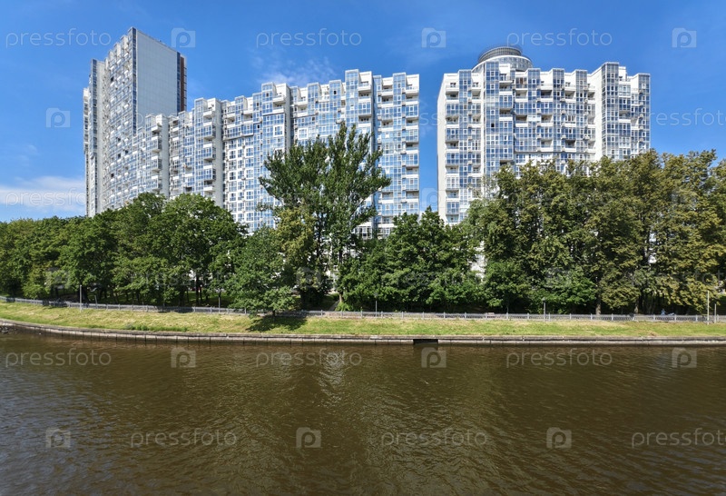 Химки, многоэтажное жилое здание, расположенное рядом с водохранилищем в окружении деревьев