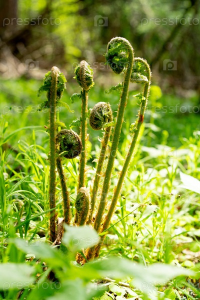 Молодые побеги папоротника, известные как рахис.Папоротники Рахиса еще не раскрыты, молодые побеги папоротника, которые часто называют папорочными улитками из-за их изогнутой формы