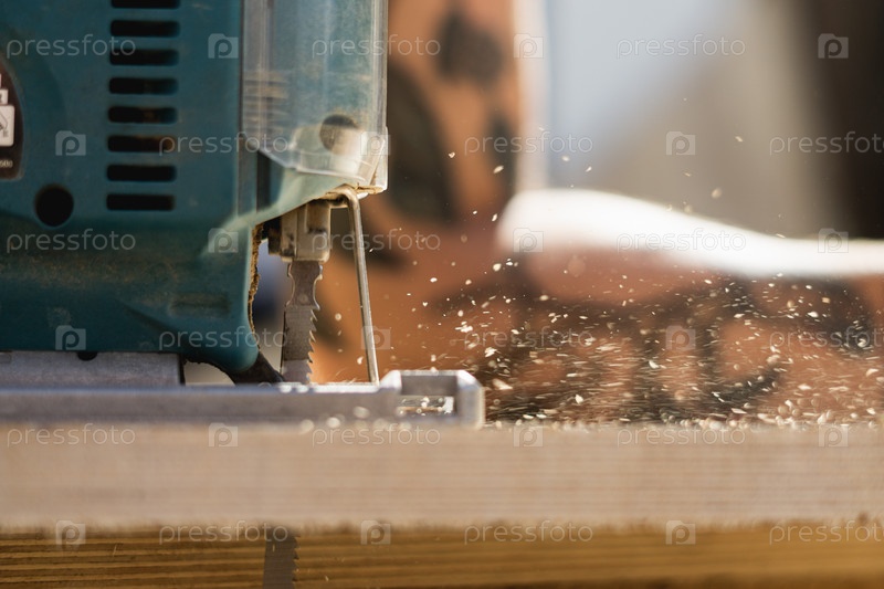Мужчина, перерезающий фанеру с помощью электрической головоломки