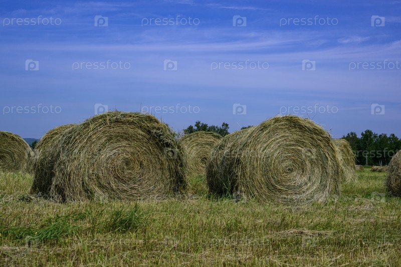 Круглые балы сена на поле под голубым небом