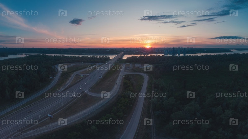 Вид с воздуха моста на шоссе при закате
