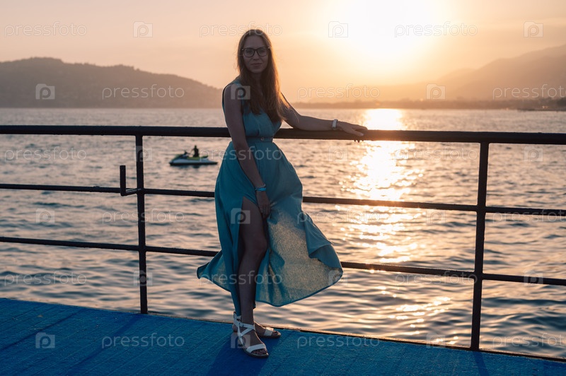 Женщина в плывущем зеленом платье позирует на пирсе у моря при закате солнца, против которого развевается турецкий флаг