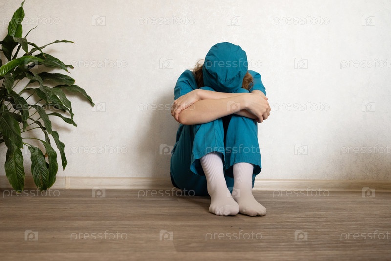 Медицинский работник, одетый в скрабы и шляпу, сидит со своими коленями, прижатыми к груди, показывая признаки эмоционального истощения