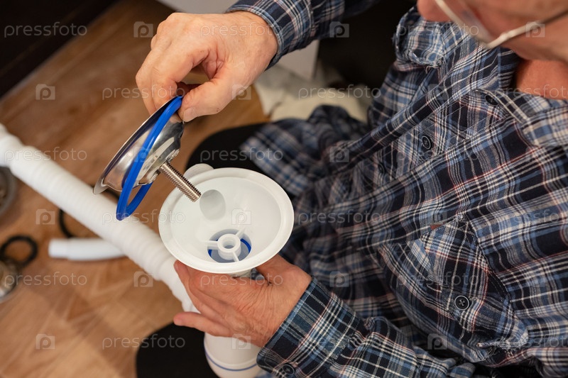 Пожилой мужчина сосредотачивается на сборке сантехнических компонентов для кухни и ванной комнаты на деревянном полу