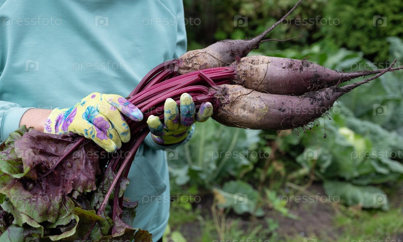 Человек, держащий свежесобранные свеклы в ярком саду в утренние летние часы