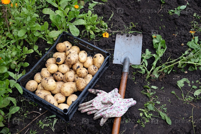 Сбор свежевыросших картофелей в солнечный день в саду с покрытыми землёй руками и резиновыми ботинками