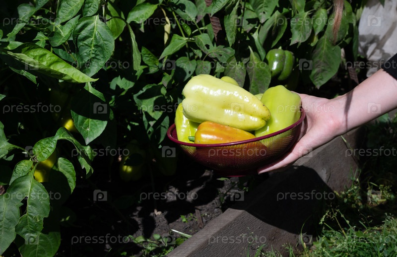 Человек выбирает спелые зеленые перец из садового клумбы, окруженного пышной лиственницей.Солнечный свет освещает яркие продукты питания, демонстрируя увлекательные садовые мероприятия