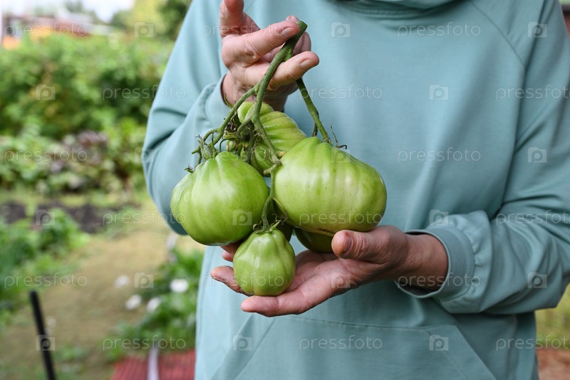 Руки нежно сжимают группу больших зеленых помидоров, стоящих в пышном саду, наполненном различными растениями