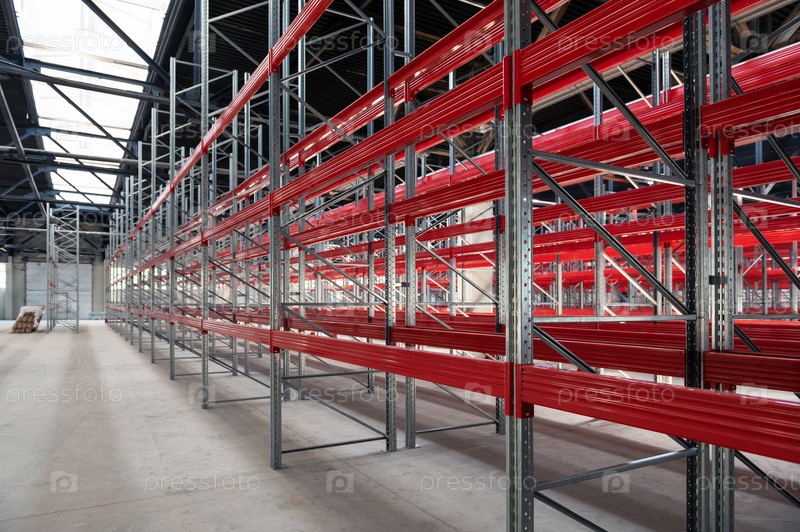 Концепция логистического склада с пустыми высокими поддонами, системой полок