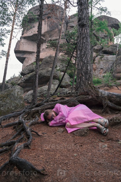 Женщина в тайговом лесу и скалах Красноярского заповедника колонн