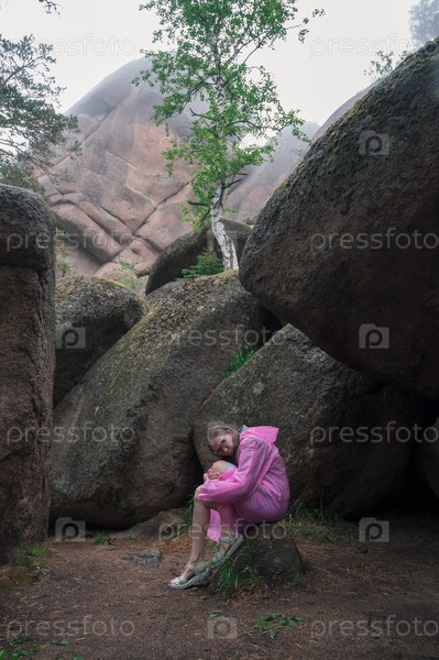 Женщина в плаще тайги и скал заповедника Стольби, Красноярск, Россия