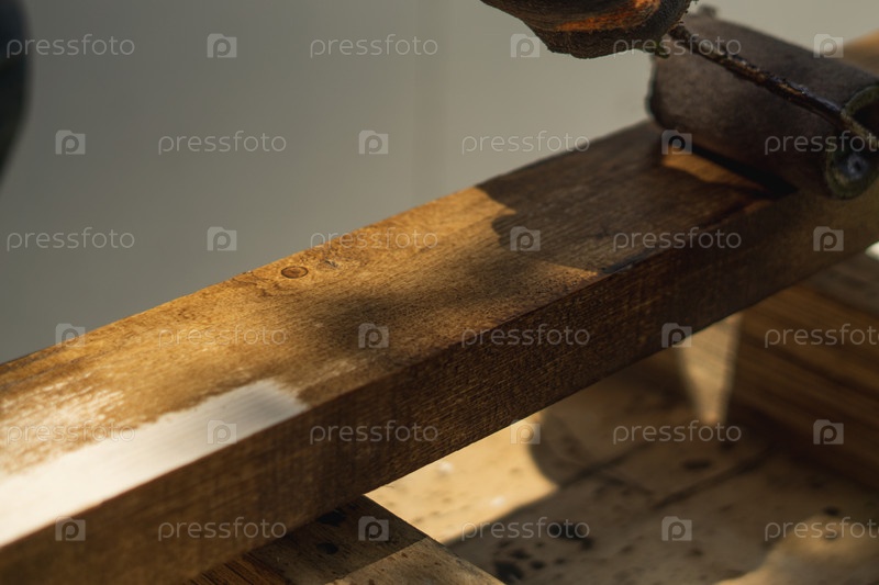 Рука в перчатке покрывает доску грилем с роликом, часть доски еще не пропитана