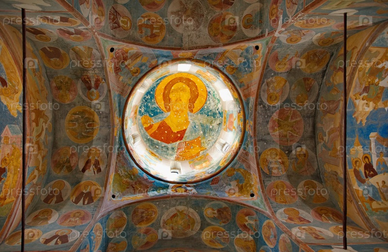Гакуга. Россия. 4 октября 2018 г. Священные фрески православного Муромского монастыря Святого Успения, расположенного на восточном берегу озера Онеги