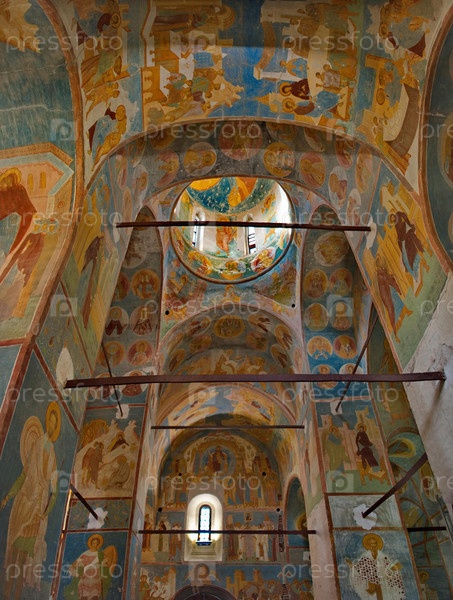 Гакуга. Россия. 4 октября 2018 г. Священные фрески православного Муромского монастыря Святого Успения, расположенного на восточном берегу озера Онеги