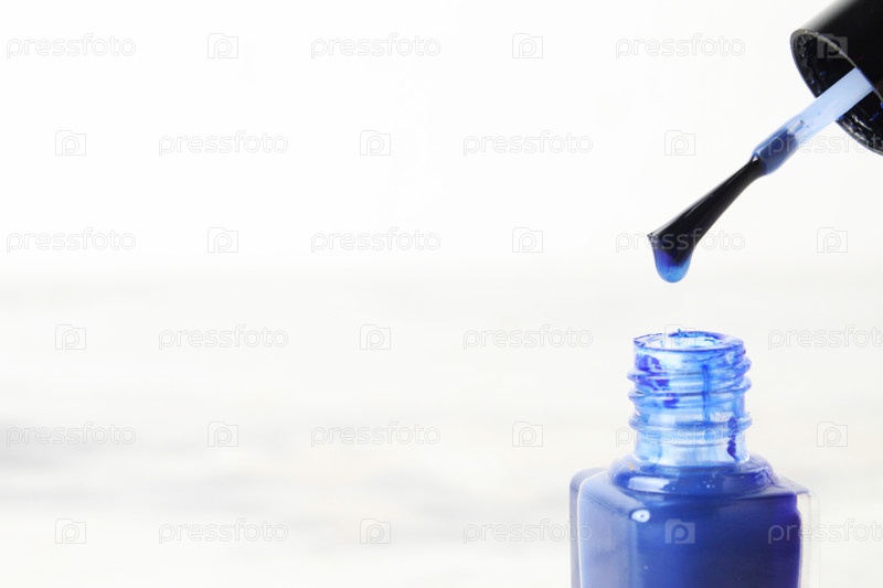 Очень крупный план бутылки лака для ногтей на светло-белом фоне пространства копировки