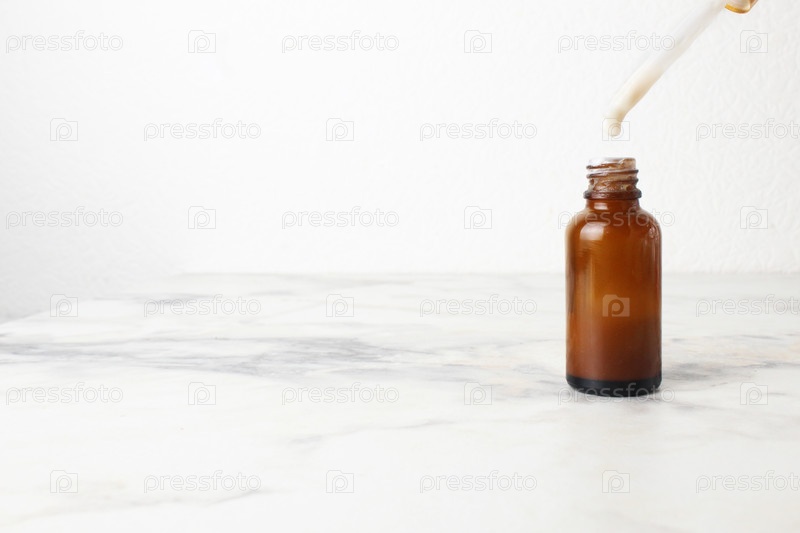 Мазь-лекарство в коричневой бутылке на белом фоне для копирования текста