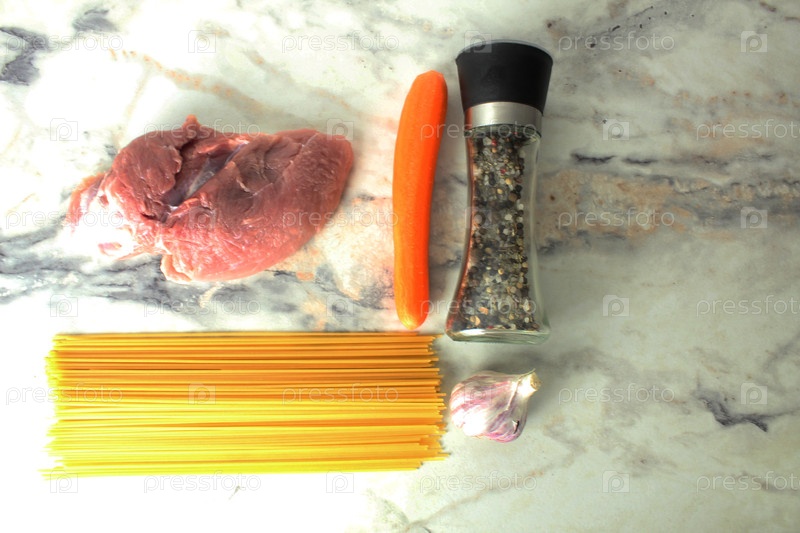 Мясо с макаронами Расположение продуктов для макаронного болонского блюда, вид сверху